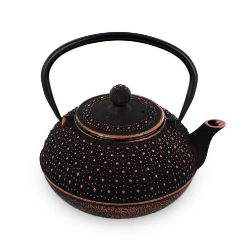 Une théière toute en sobriété et en élégance, joliment parée de ses dorures qui vous offrira une pause thé très agréable ! Son format classique est agrémenté de ses jolis picots qui lui amènent sont originalité. Intérieur émaillé et livrée avec un filtre en inox. Les théières en fonte sont des objets d’art du quotidien. Conseils d’utilisation : Préparez-vous tous types de thé avec cette magnifique théière. Placez une dose de thé dans le filtre en inox, puis versez l’eau chaude par-dessus. Laissez le thé s’infuser puis dégustez ! Pays d’origine : Ce sont les Chinois qui ont découvert la fonte en 300 de notre ère. Traditionnellement, les Chinois consomment le thé directement à la tasse, et ce n’est que sous la dynastie Ming que se sont développées les premières théières. Les arômes du thé : La théière en fonte Sui est une théière dite « sans mémoire ». Elle peut être utilisée pour tous les thés, car son intérieur émaillé empêche le transfert des arômes dans son composant. Conseils d’entretien : Avant la première utilisation, remplissez puis videz votre théière Song avec de l’eau bouillante 2 à 3 fois, puis essuyez-la avec un linge sec sans vous brûler. Lors du nettoyage de votre théière après utilisation, évitez l’utilisation de détergents et d’élément abrasif. Lavez-la à l’eau chaude et surtout essuyez l’extérieur avec un torchon sec.