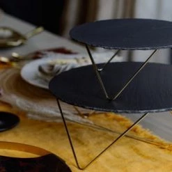 Artesà Plats, Saladiers Et Coupelles Plateau De Service 2 Niveaux En Ardoise Noir Et Doré