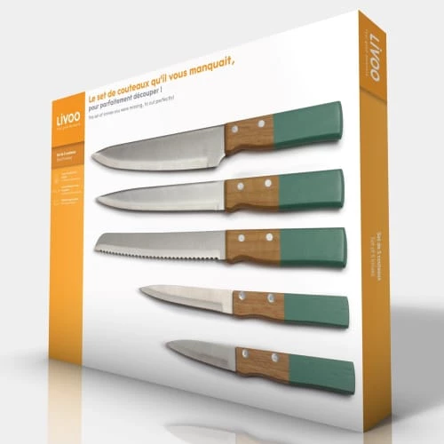 1 couteau chef 20 cm, 1 couteau à pain 20 cm, 1 couteau de cuisine 2 cm, 1 couteau tranchelard 12,5 cm et un couteau office 7,5 cm
