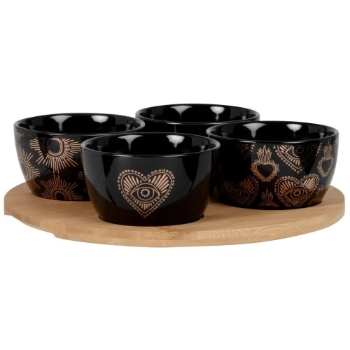 Maisons Du Monde Plats Apéritif Et Accessoires Coupelles Apéritives En Grès Noir Et Doré (x4) Avec Support En Bambou