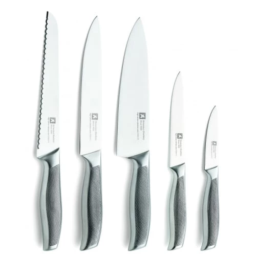 matière : Ce bloc est composé d’un couteau d’office de 20.8 cm avec une lame de 9.2 cm, un couteau à pain de 33.9 cm avec une lame de 21 cm, un couteau universel de 24,8 cm avec une lame de 12.9 cm, un couteau de chef de 33.5 cm avec une lame de 20 cm et un couteau à découper de 33.5 cm avec un lame de 19.6 cm. les couteaux sont en inox avec un manche gravé de picots et le bloc est en bois d’hévéa, naturel, durable et résistant. Matière : Inox Couleur : Marron Longueur : 27.5 cm Largeur : 6 cm Hauteur : 21.3 cm