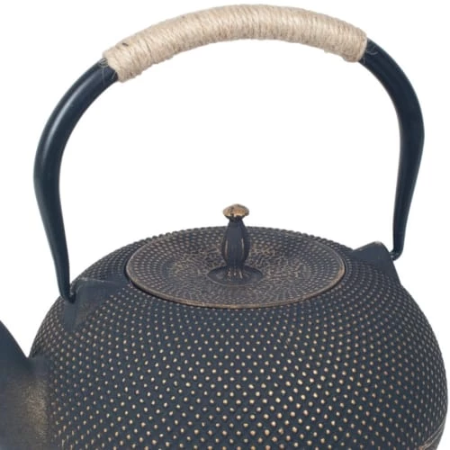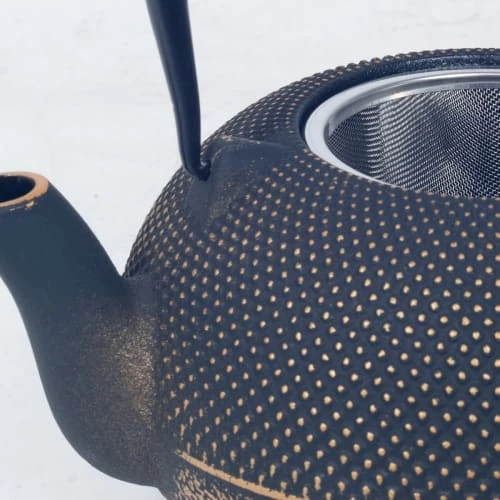 Théière de type japonaise noire en fonte 1.8 litre Fonte Émaillée 1.8 Litre Livrée avec un infuseur Dimensions avec anse : Hauteur 21.5 cm – Largeur 22.5 cm – Profondeur 18 cm Avec son intérieur émaillé, cette théière en fonte est destinée à infuser tous vos thés sans garder leurs arômes en mémoire. La théière en fonte a pour caractéristique de rouiller. Ne vous inquiétez pas trop de la rouille, en effet la rouille de la théière en fonte n’est pas nocive pour la santé humaine.