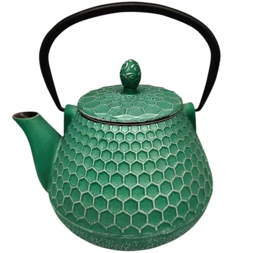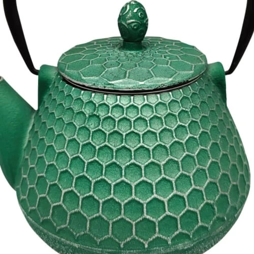 Théière de type japonaise verte en fonte 1 litre Fonte Émaillée 1 litre Livrée avec un infuseur Dimensions avec anse : Hauteur 17.5 cm – Largeur 17 cm – Profondeur 14.5 cm Avec son intérieur émaillé, cette théière en fonte est destinée à infuser tous vos thés sans garder leurs arômes en mémoire. La théière en fonte a pour caractéristique de rouiller. Ne vous inquiétez pas trop de la rouille, en effet la rouille de la théière en fonte n’est pas nocive pour la santé humaine.