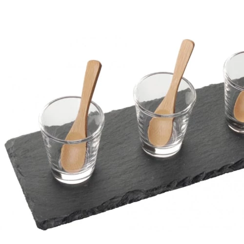 Set composé de 7 pièces pour apéritif: 1 plateau ardoise, 3 verrines, 3 cuillères en bois.