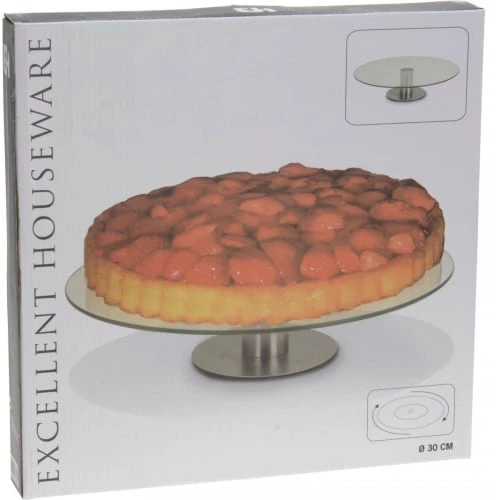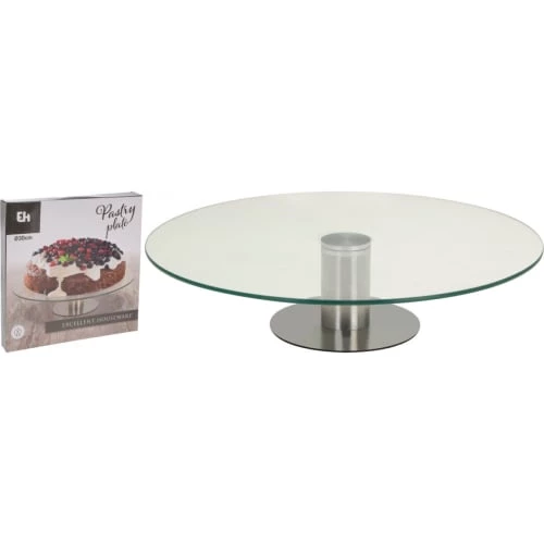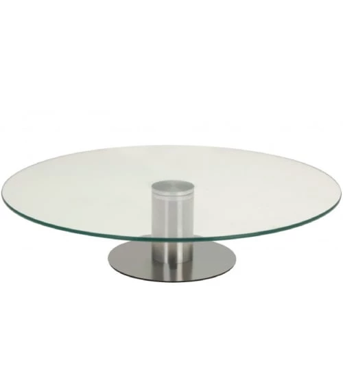 Présentoir à gâteau ou tarte en verre sur pied en métal chromé. Rotatif. Dimensions: diamètre 30cm – Couleur: Transparent et Chrome – Matière: Verre et Métal